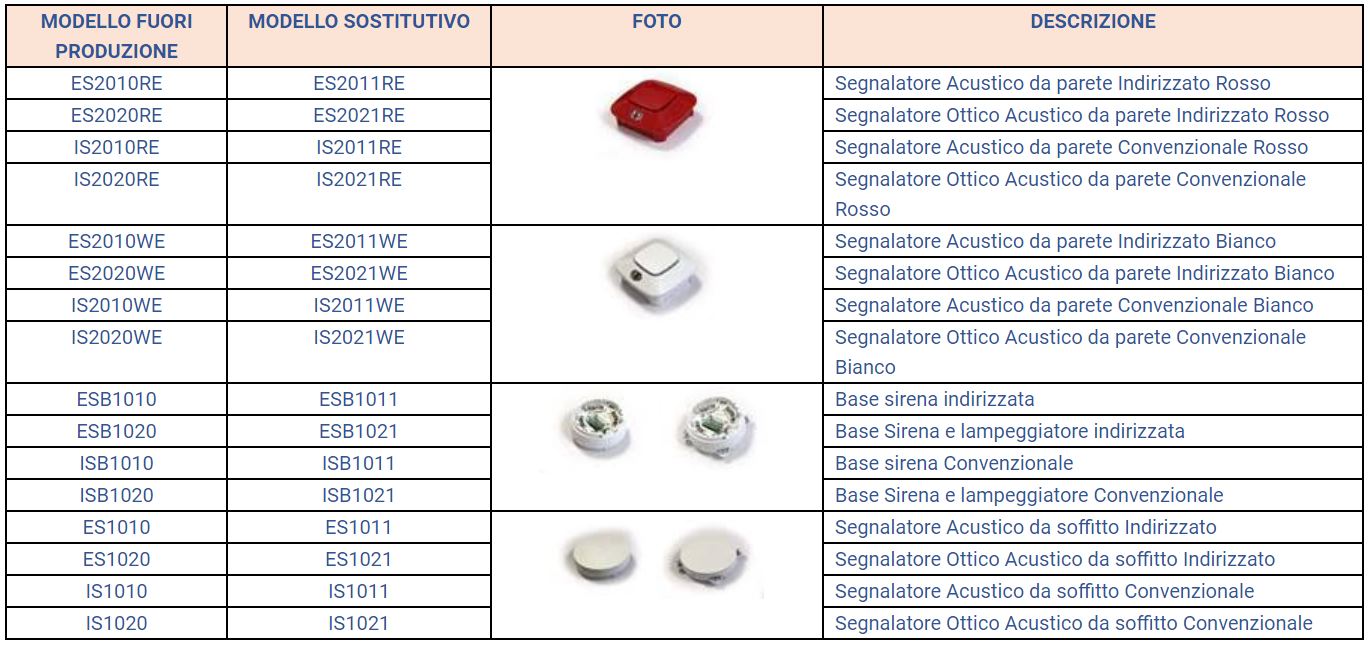 la presente per comunicarLe che i segnalatori allarme incendio di seguito elencati verranno messi fuori produzione per lasciare posto alle rispettive versioni della nuova serie a basso consumo.