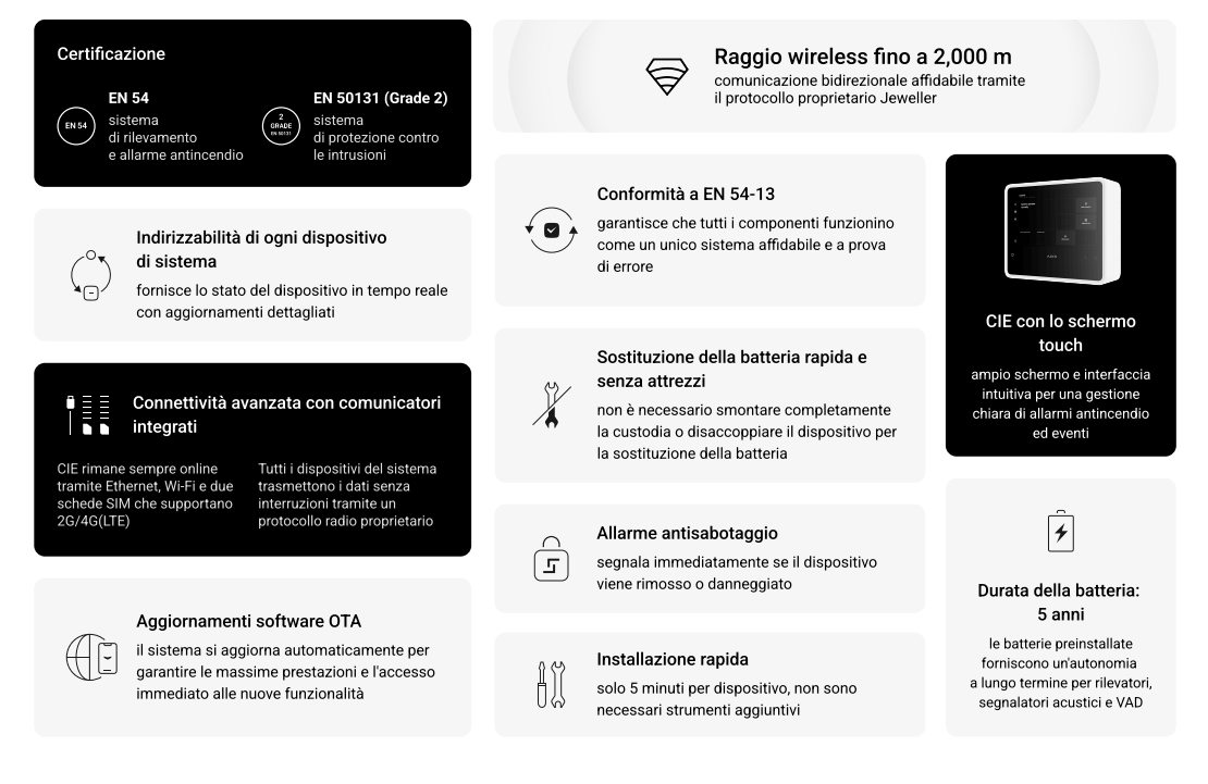 EN54 Line è un sistema integrato di rilevamento e allarme antincendio completamente wireless, progettato per garantire un'affidabilità senza pari in ambienti commerciali e residenziali. Facile e veloce da programmare, si adatta perfettamente anche a progetti di grandi dimensioni. La centrale è dotata di uno schermo touch ad alto contrasto, comunicatore integrato, scheda di rete e interfaccia radio. La CIE offre un'opportunità unica: rivoluzionare le attività di installazione e monitoraggio degli allarmi, offrendo la possibilità di integrare in un unico sistema il rilevamento antincendio conforme alla norma EN 54, l'allarme antintrusione secondo la norma EN 50131 (Grade 2), l'automazione e la videosorveglianza.