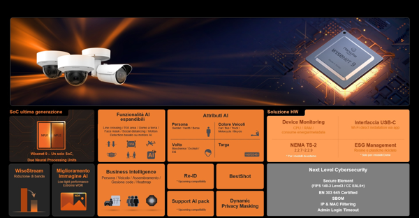 Grazie al potente SoC Wisenet 9, garantiscono un elevato grado di precisione e accuratezza degli algoritmi di analisi video ed un livello di cybersicurezza allineato ai più elevati standard.