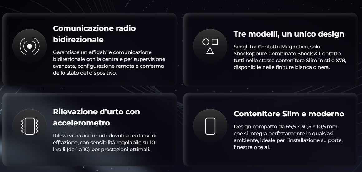 Sensori Radio Bidirezionali Slim Shock e Slim Shock con Contatto Magnetico offrono una protezione avanzata e affidabile per porte, finestre, lucernari, caveau e altre aperture perimetrali, ora in un design sottile e compatto.