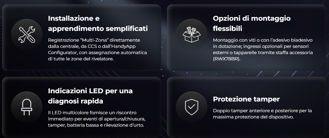 E' disponibile un accessorio, che aggiunge due zone al sensore e consente di collegare dispositivi esterni,, come ingressi tapparella e contatti magnetici, garantendo un'affidabile protezione perimetrale 24 ore su 24. Ogni zona è gestita come zona indipendente e può essere configurata e controllata separatamente.